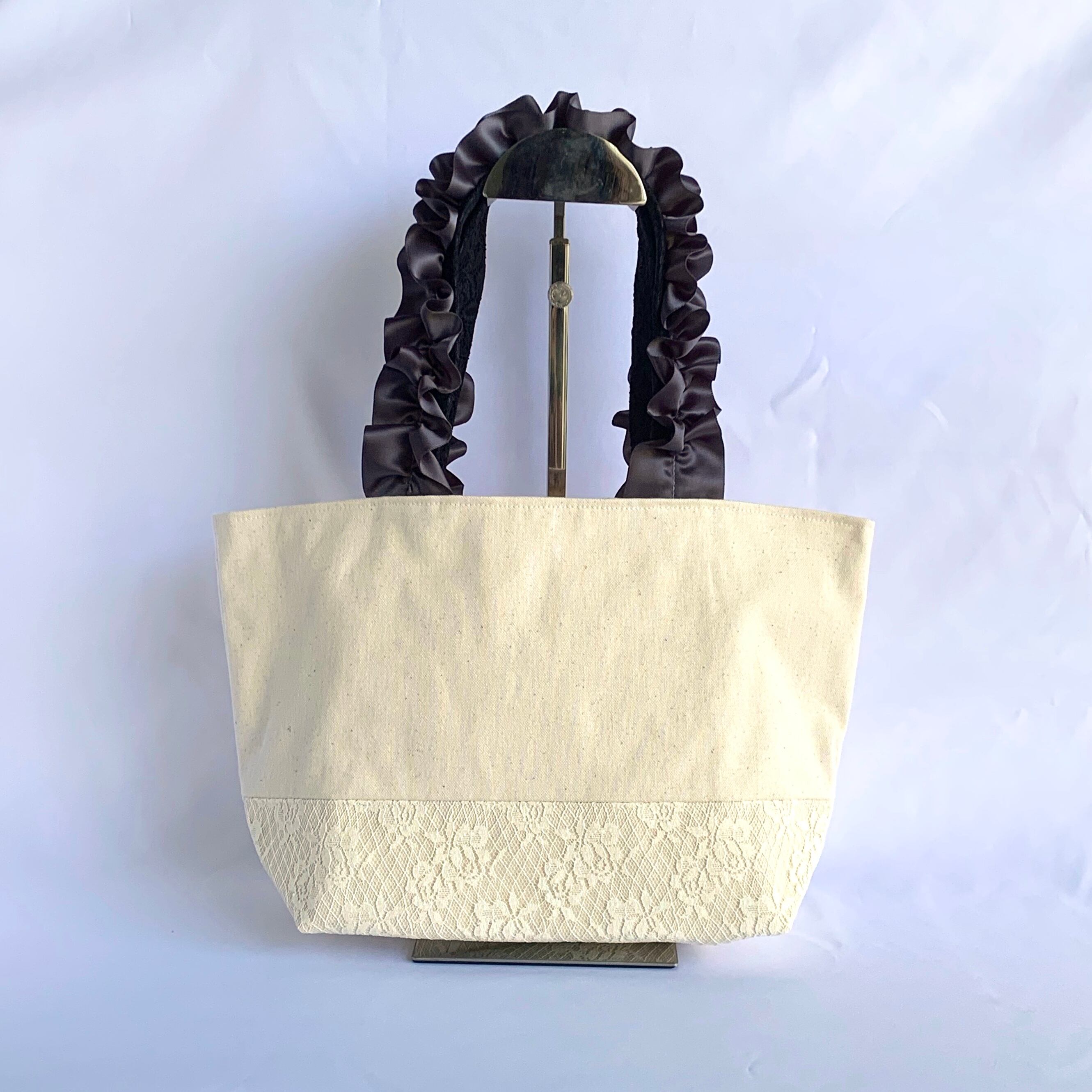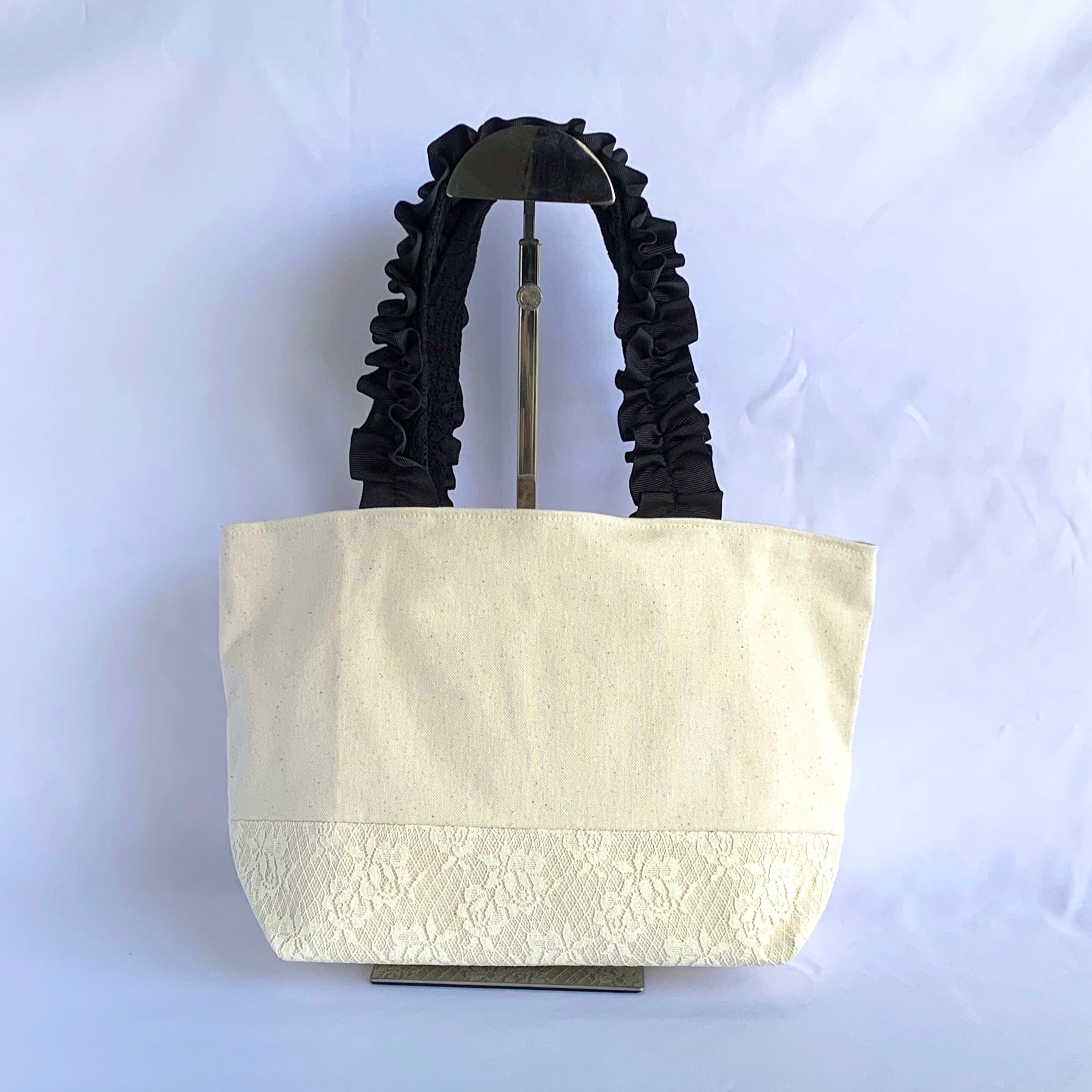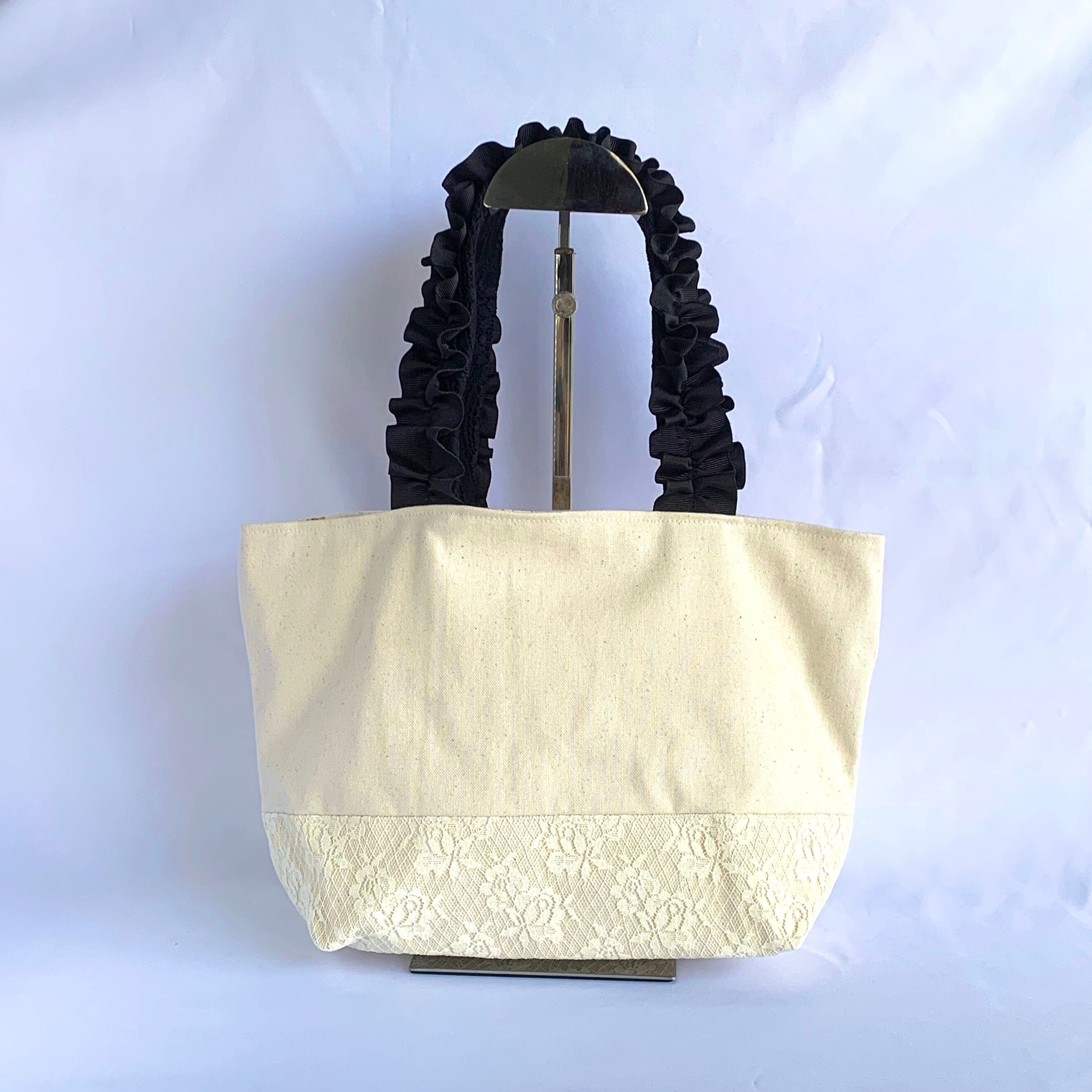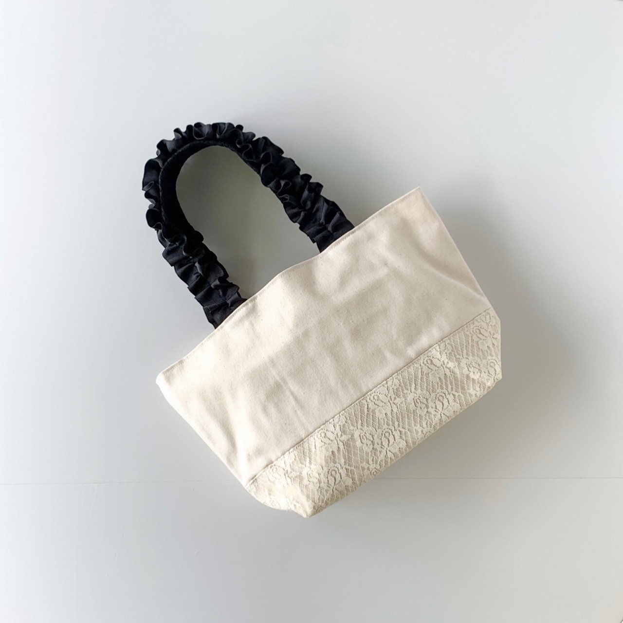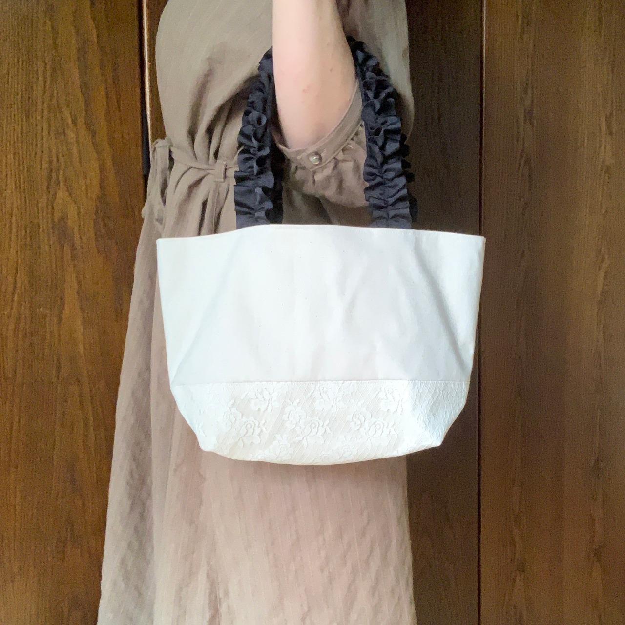 本体のレース切り替えがポイントのフリルハンドルトートバッグ。