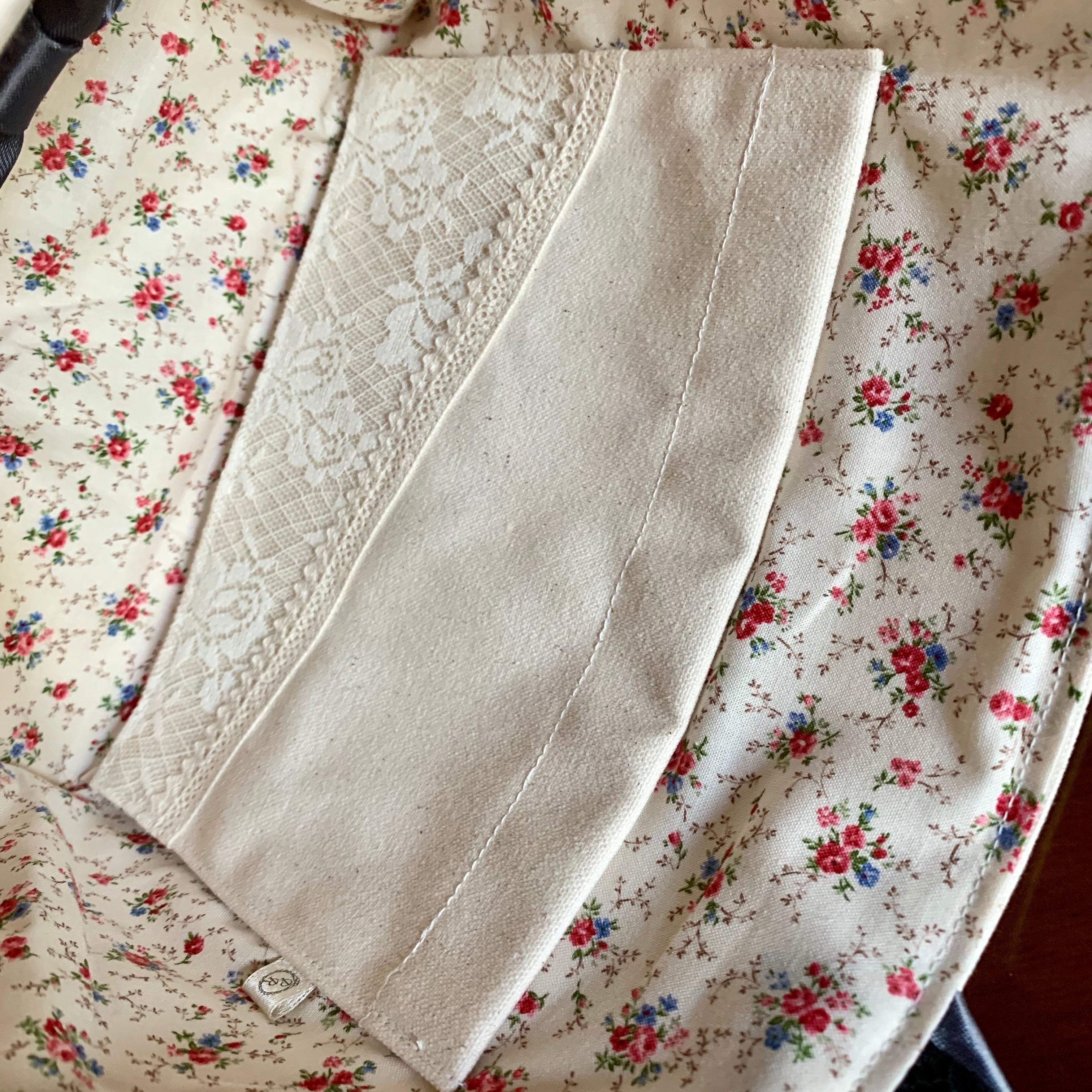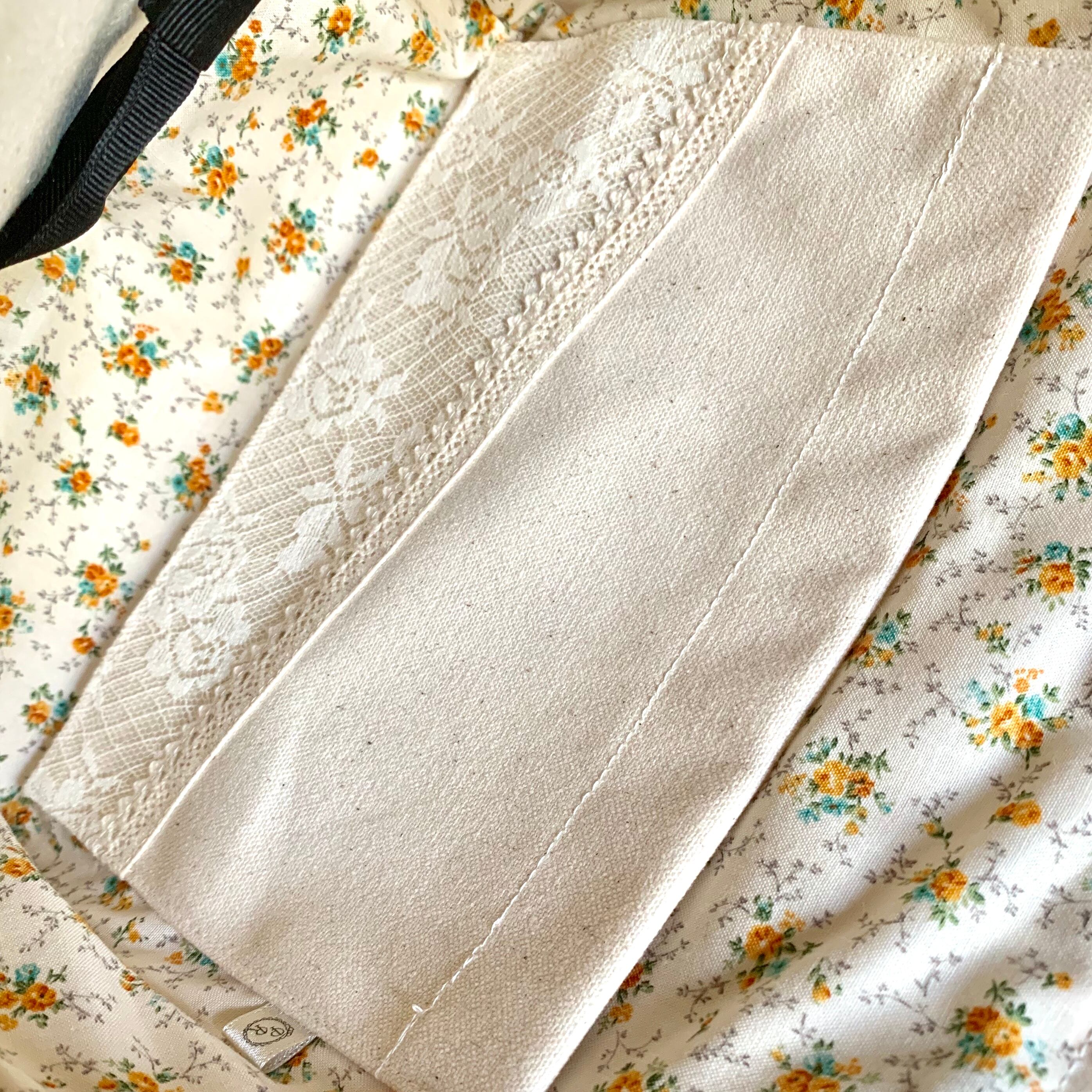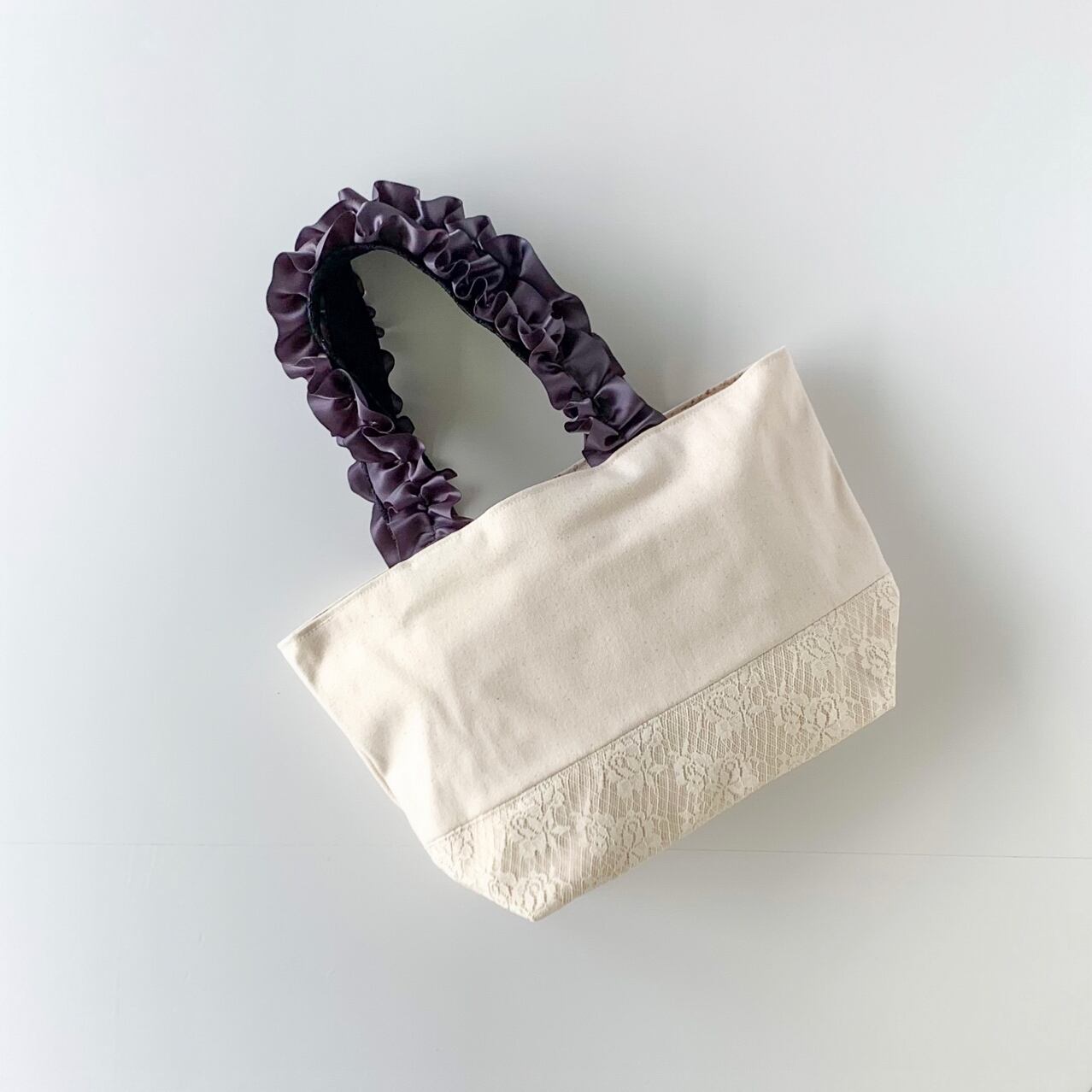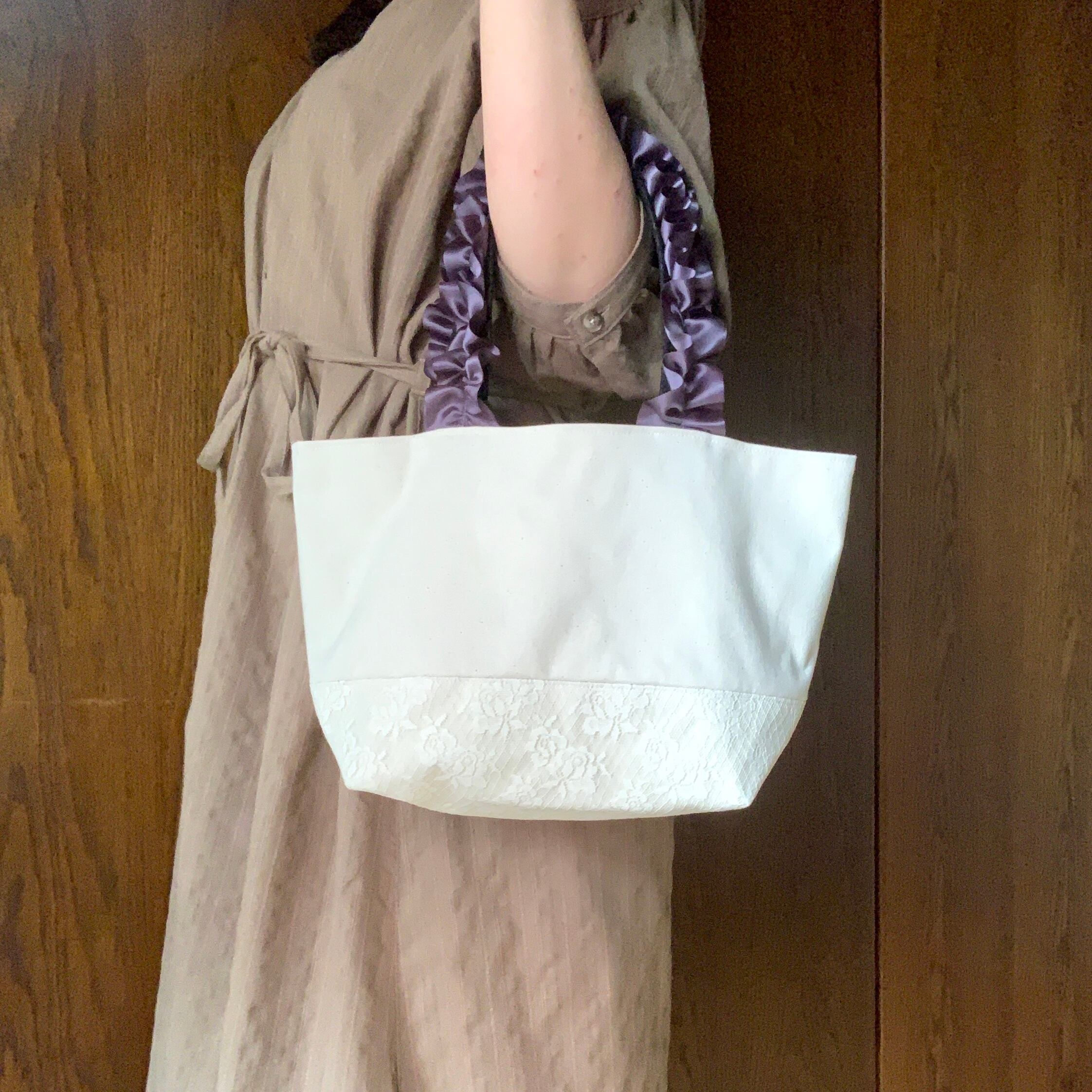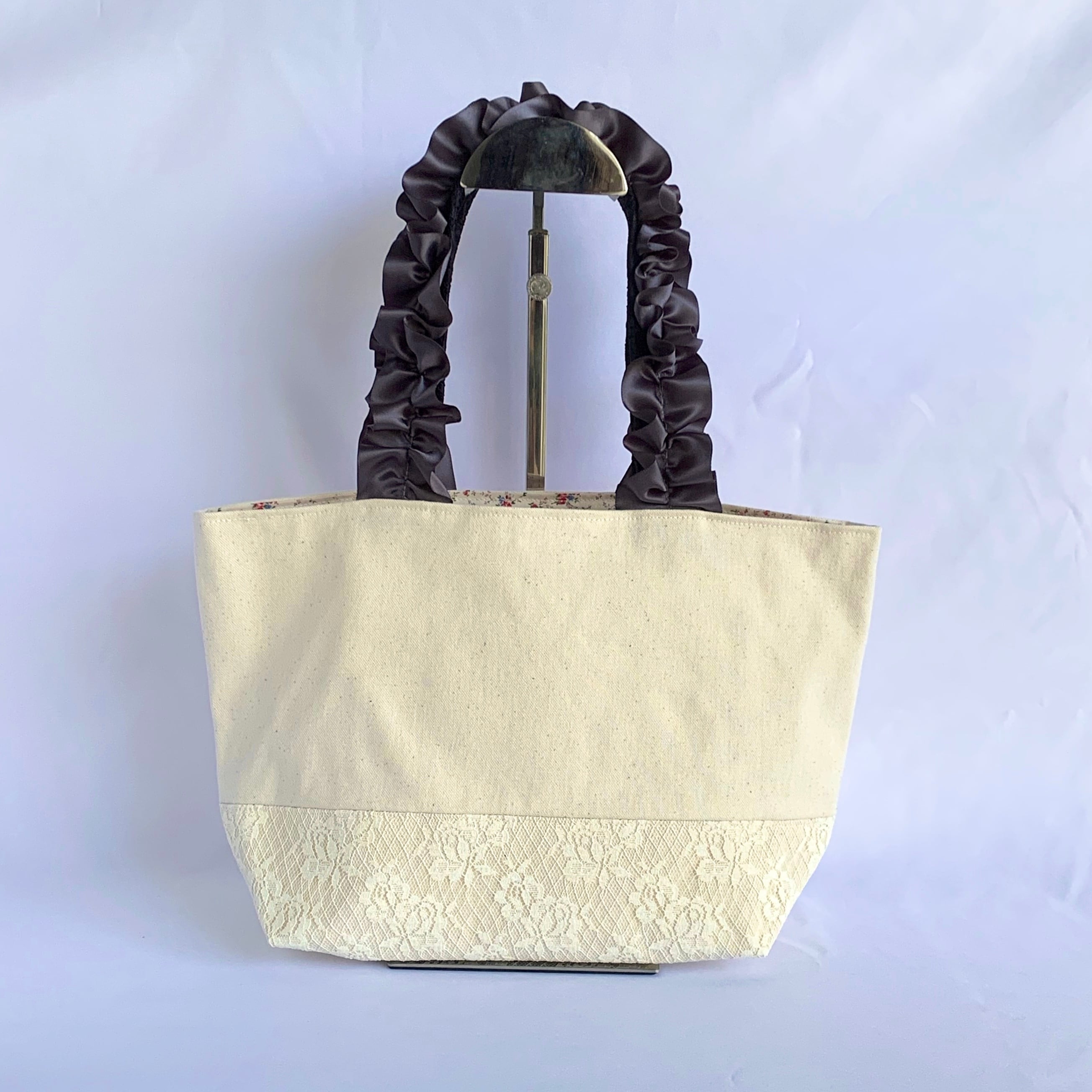 本体のレース切り替えがポイントのフリルハンドルトートバッグ。
