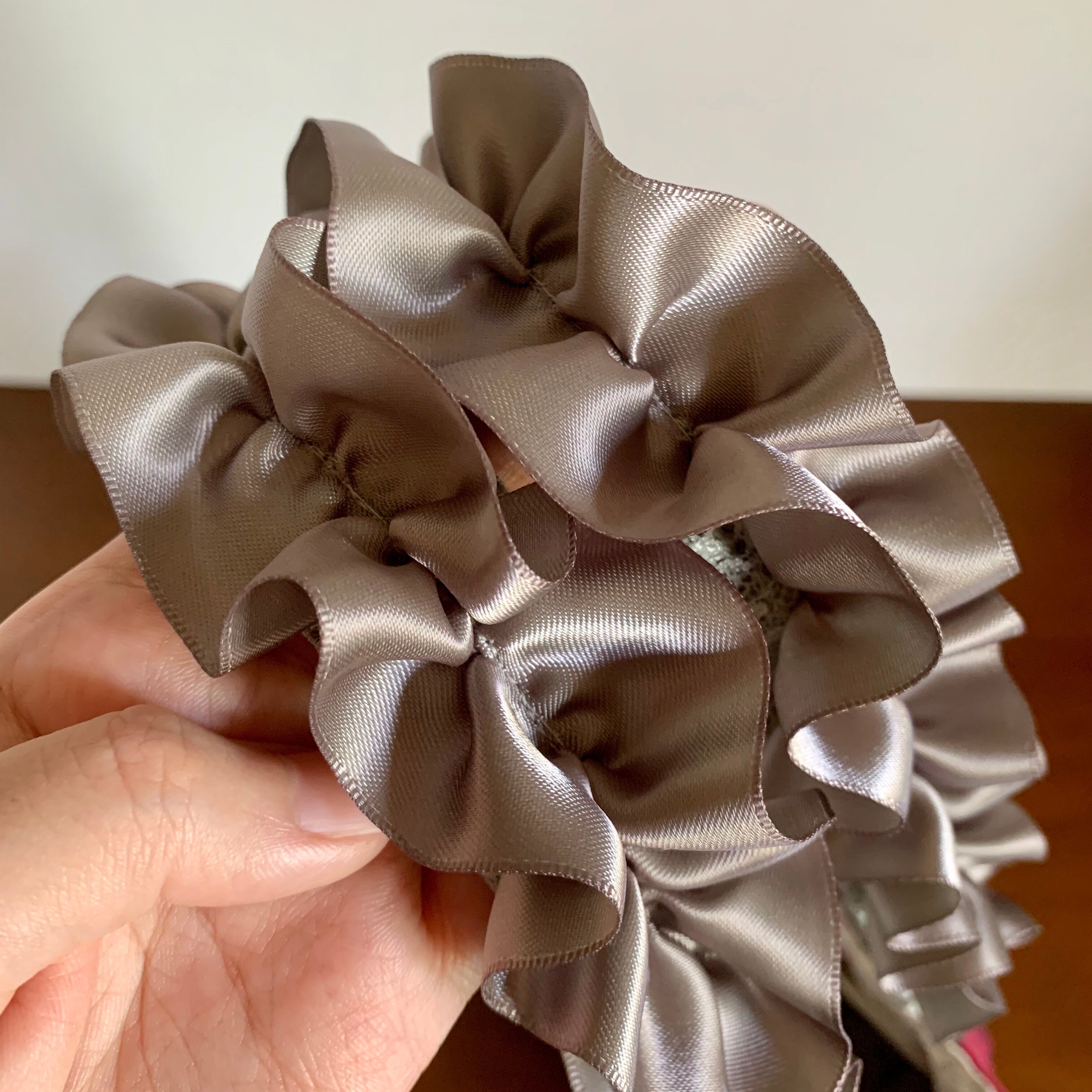 ○持ち手のアクリルベルトにはレースを巻きつけ、フリルのない裏側も可愛くなるように仕上げました。
