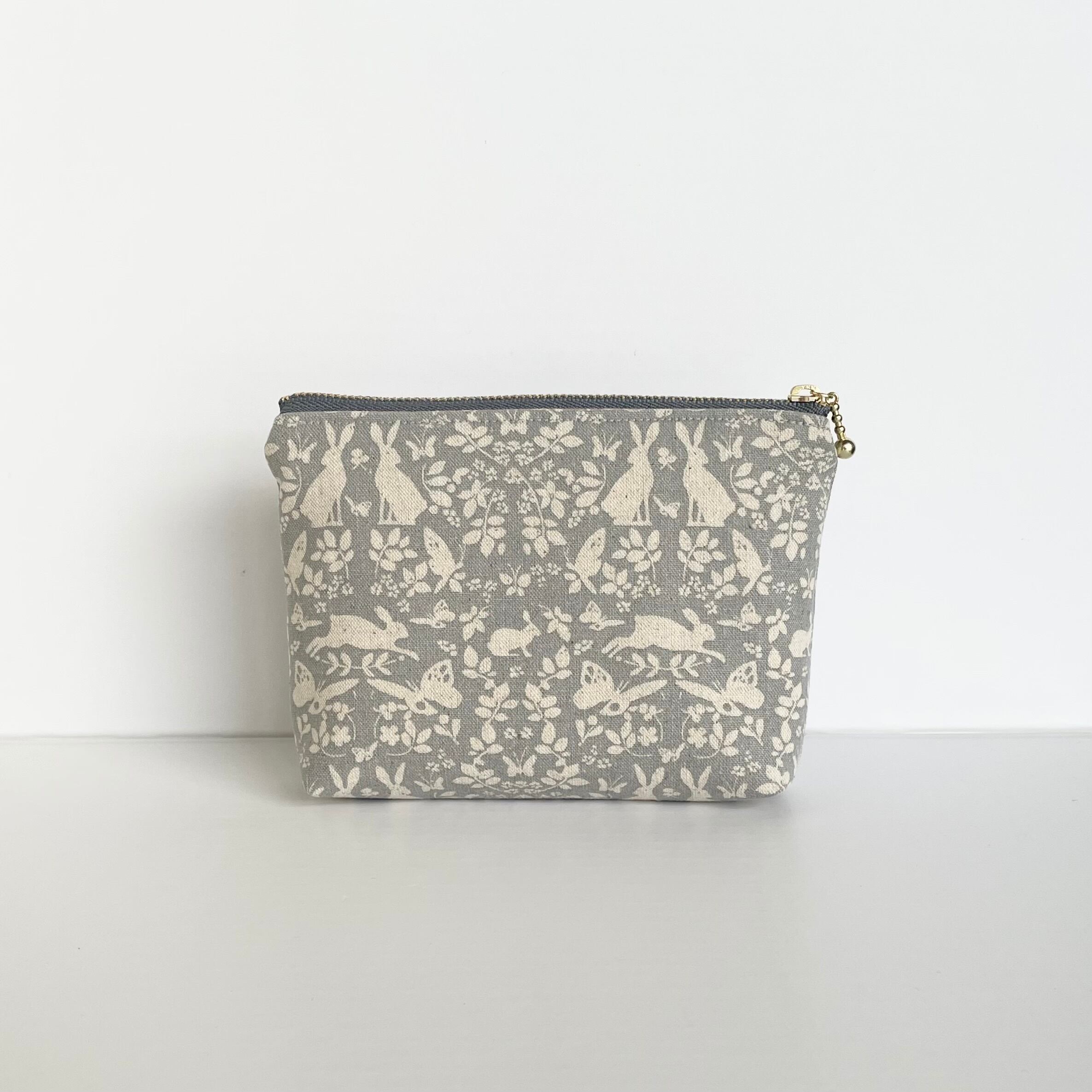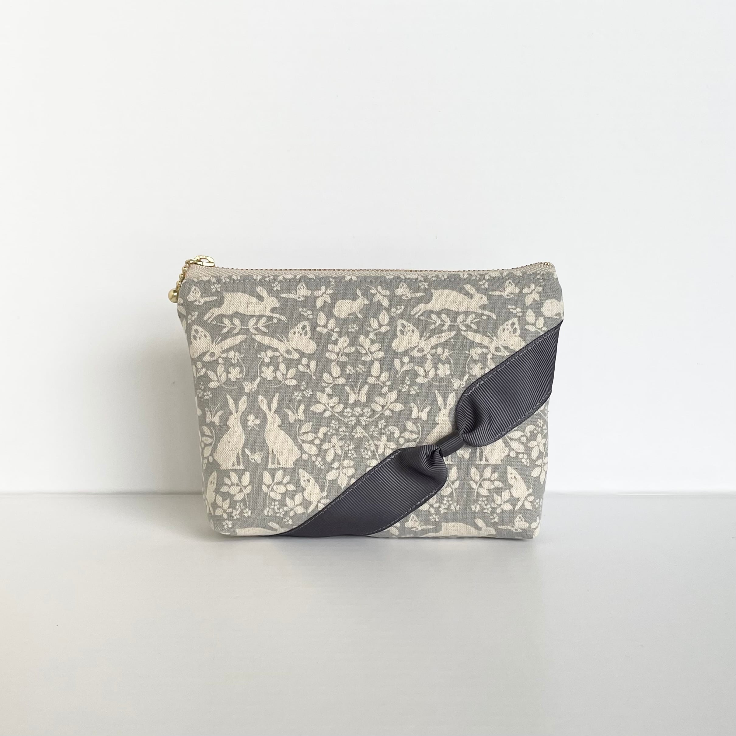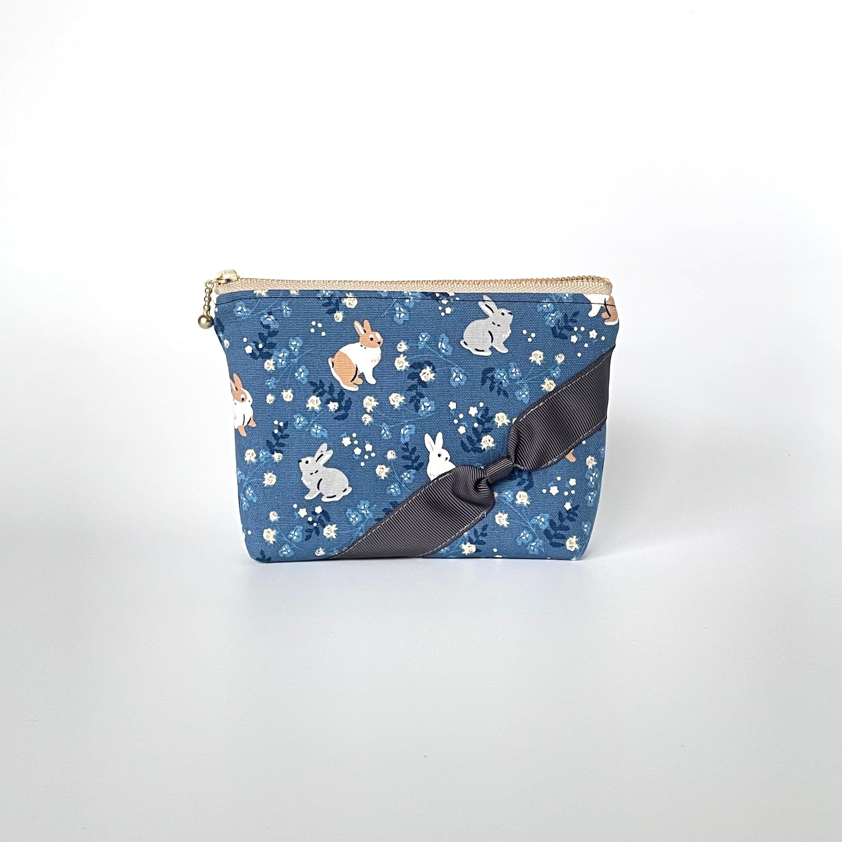 大人のリボンポーチ、写真1枚目からうさぎ青、うさぎグレー×濃グレーリボン、うさぎグレー×薄グレーリボンです。