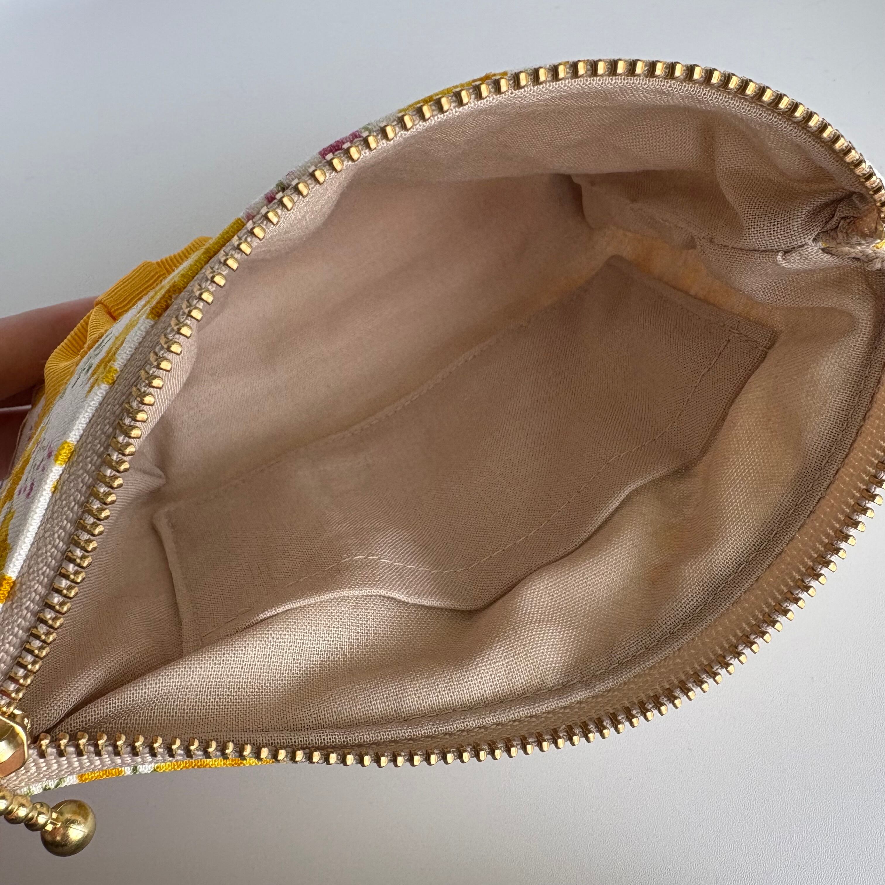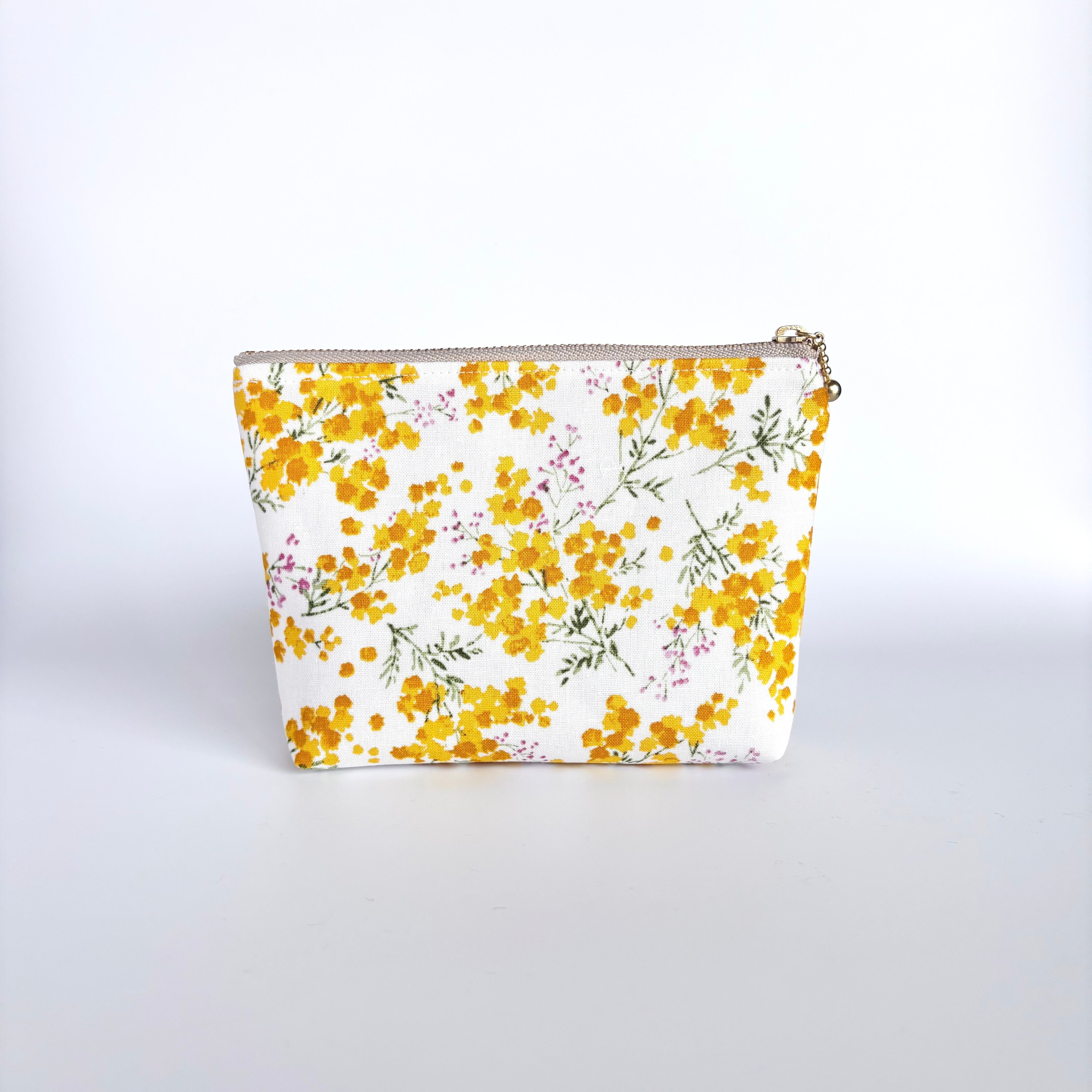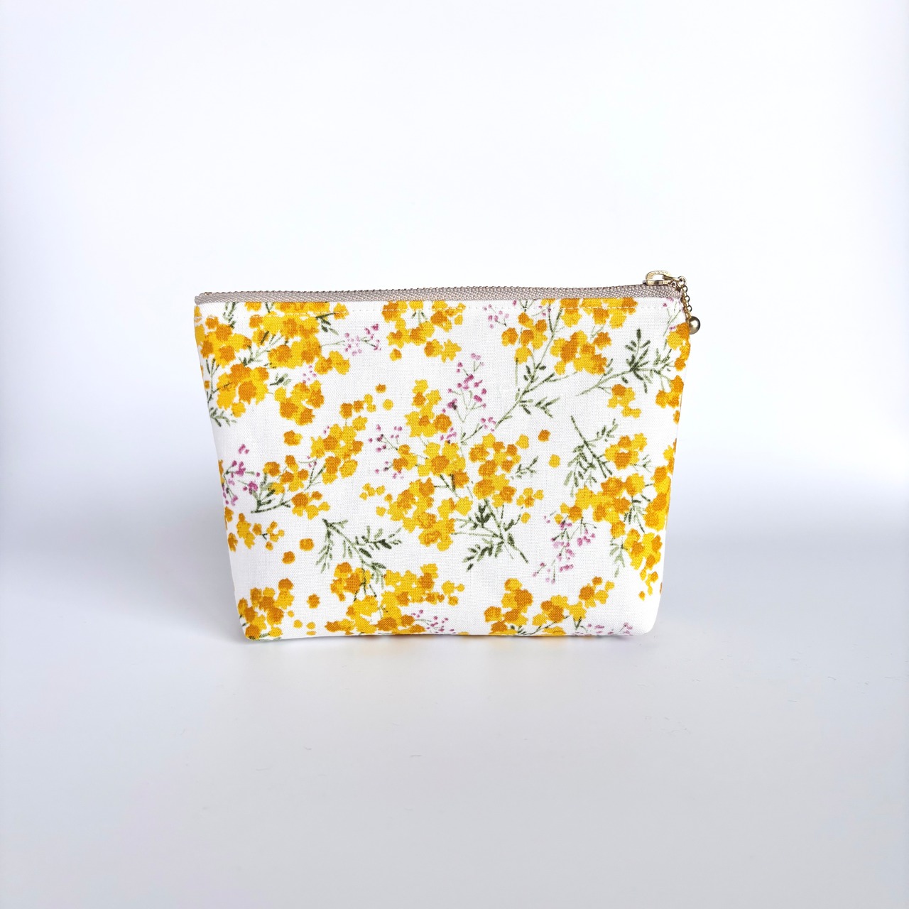 ○ミモザ柄の生地にミモザカラーのリボンでラッピングしたかのようなリボンポーチ。